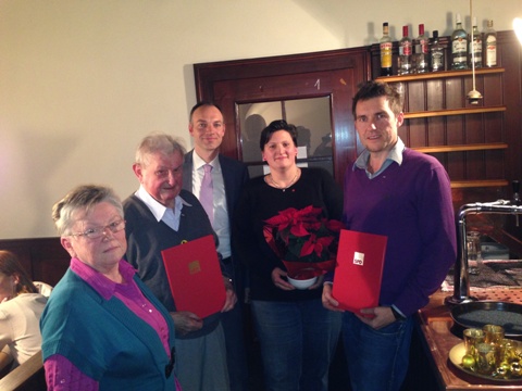 Eine weitere, außergewöhnliche Freude war es, an diesem Abend Johann Herbst zu ehren (im Bild 2. von links). Er ist seit 65 Jahren der SPD treu und nahm aus den Händen der stellvertretenden Vorsitzenden und Stadträtin Karin Gottschall seine Ehrungsurkunde entgegen und zeigte sich gerührt vom starken Beifall der Anwesenden. Seine Zeit in der SPD sei "immer sehr schön gewesen", betonte der SPD-Senior, der leider aus gesundheitlichen Gründen nicht mehr so aktiv im Ortsverein sein kann wie er es möchte.
