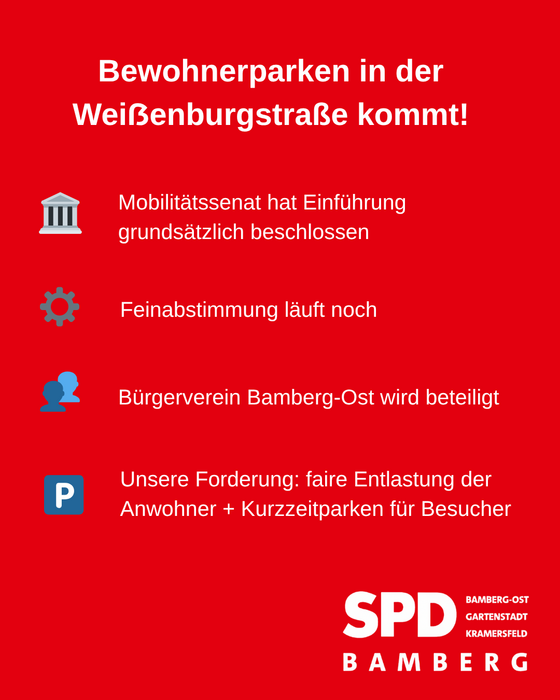 Wir als SPD im Bamberger Osten setzen uns dafür ein, dass die Lebensqualität in unserem Viertel gesichert und verbessert wird. Dazu gehört auch eine faire Lösung für die Parksituation.