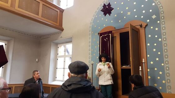 Etwa 30 Gäste erlebten eine lehrreiche Führung unter der Leitung von Dr. Rajaa Nadler. Die Synagoge wurde 1822 eingeweiht und in der Reichspogromnacht 1938 geschändet, allerdings glücklicherweise nicht zerstört, so dass sie 1994 wieder eröffnet werden konnte. Seitdem dient die Synagoge als wichtiger Ort des Erinnerns an die jüdische Geschichte in Franken und als Ort der Begegnung.